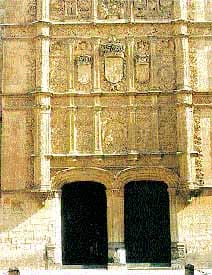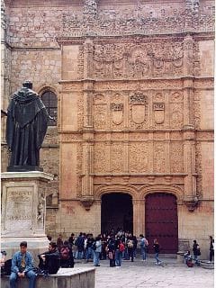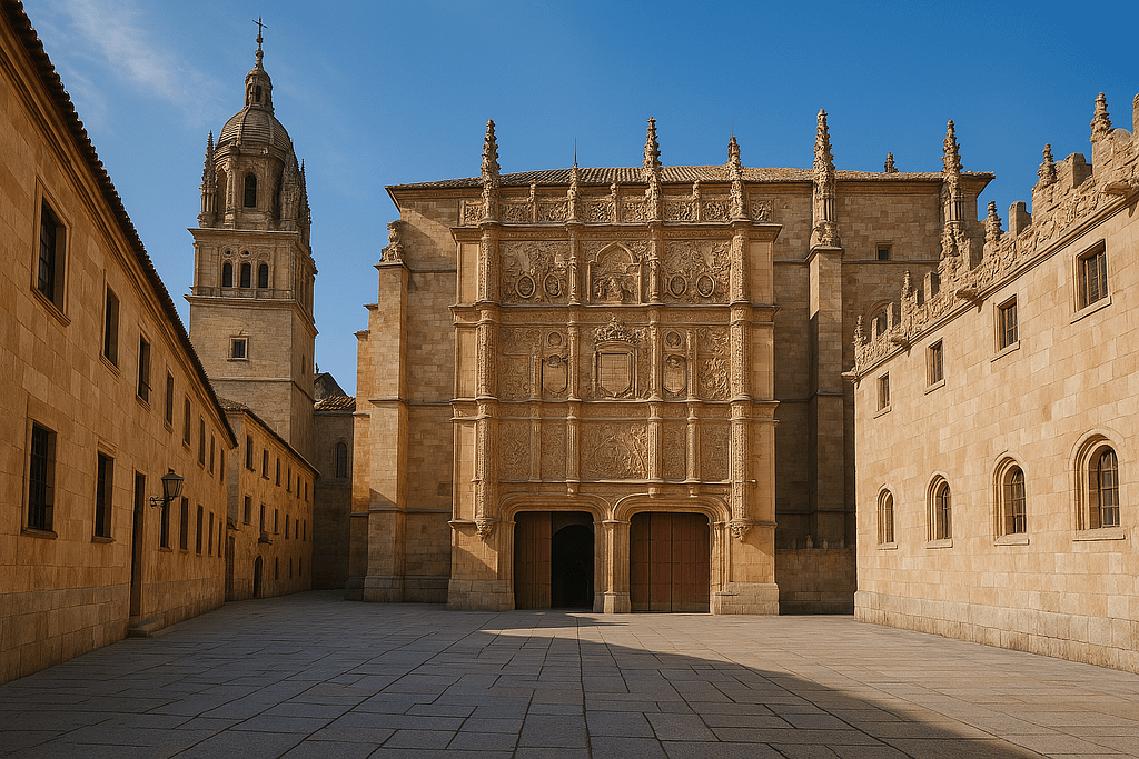 La Fachada Rica de la Universidad, obra cumbre del plateresco español, fue terminada en 1553 y constituye un auténtico libro pétreo repleto de enigmas. En su primer cuerpo destaca un medallón dedicado a los Reyes Católicos con una inscripción en griego que significa «Los Reyes a la Universidad y la Universidad a los Reyes». El segundo nivel exhibe tres escudos flanqueados por medallones de Carlos V y la reina Juana, mientras el tercero presenta alegorías complejas que incluyen a Hércules y Venus.