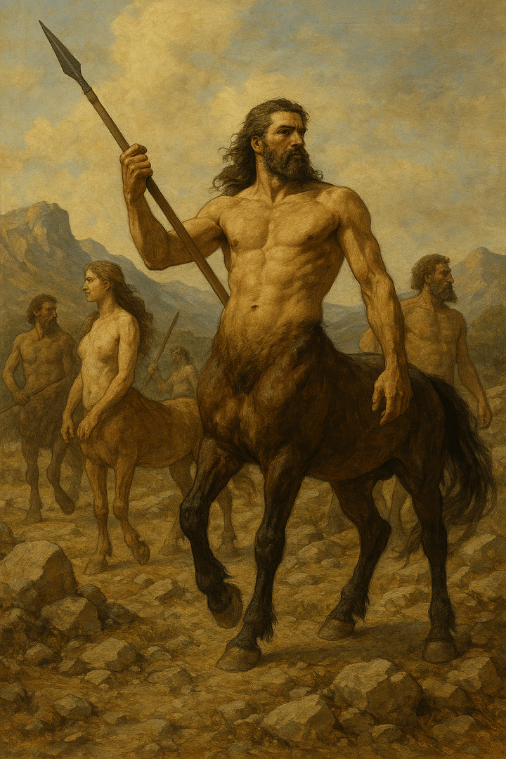 «Centauros» se refiere a criaturas mitológicas de la antigua Grecia que tienen el torso, brazos y cabeza de un ser humano, y el cuerpo y las patas de un caballo. Son híbridos mitológicos conocidos por su fuerza, velocidad y naturaleza salvaje, aunque no todos eran violentos. Algunos centauros, como Quirón, eran sabios y civilizados, conocidos por su conocimiento en medicina, filosofía y artes.