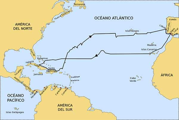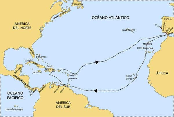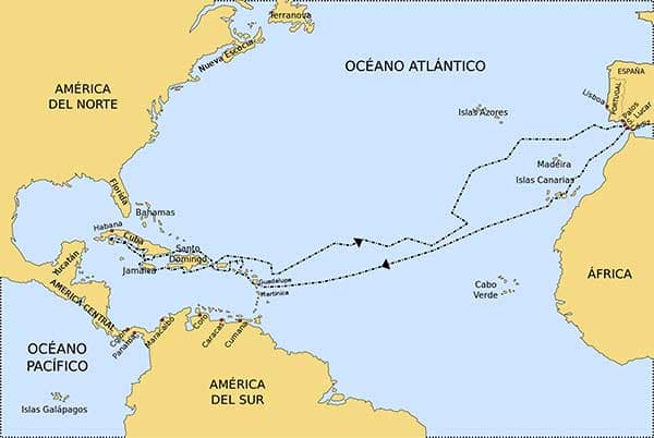 Con tres carabelas, la Pinta, la Niña y la Santa María (esta última propiedad de Juan de la Cosa, quien embarcó en ella como maestro o piloto), bajo el mando, respectivamente de Martín Alonso Pinzón, Vicente Yáñez Pinzón y del mismo Colón, se hicieron a la mar el 3 de agosto de 1492 en el puerto de Palos y se dirigieron hacia las islas Canarias, donde recalaron para reparar algunos desperfectos de la Pinta y la Niña y para que Colón realizara algunas visitas antes de arrostrar el océano.