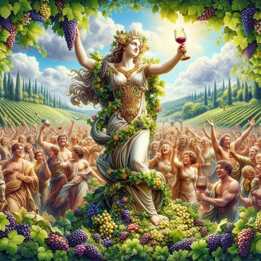- Dios del vino y la vid: Representa la fertilidad, la agricultura y el ciclo de la vida (cultivo, cosecha y fermentación).