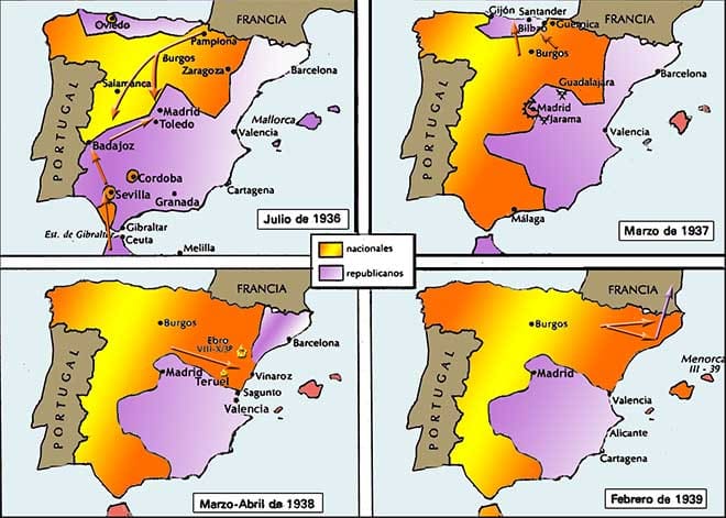 Así se inició una sangrienta guerra civil entre dos frentes. Por un lado, los izquierdistas, apoyado por Rusia, Francia e Inglaterra y, por otro lado, los derechistas, con el respaldo de la Italia de Mussolini y la Alemania de Hitler.