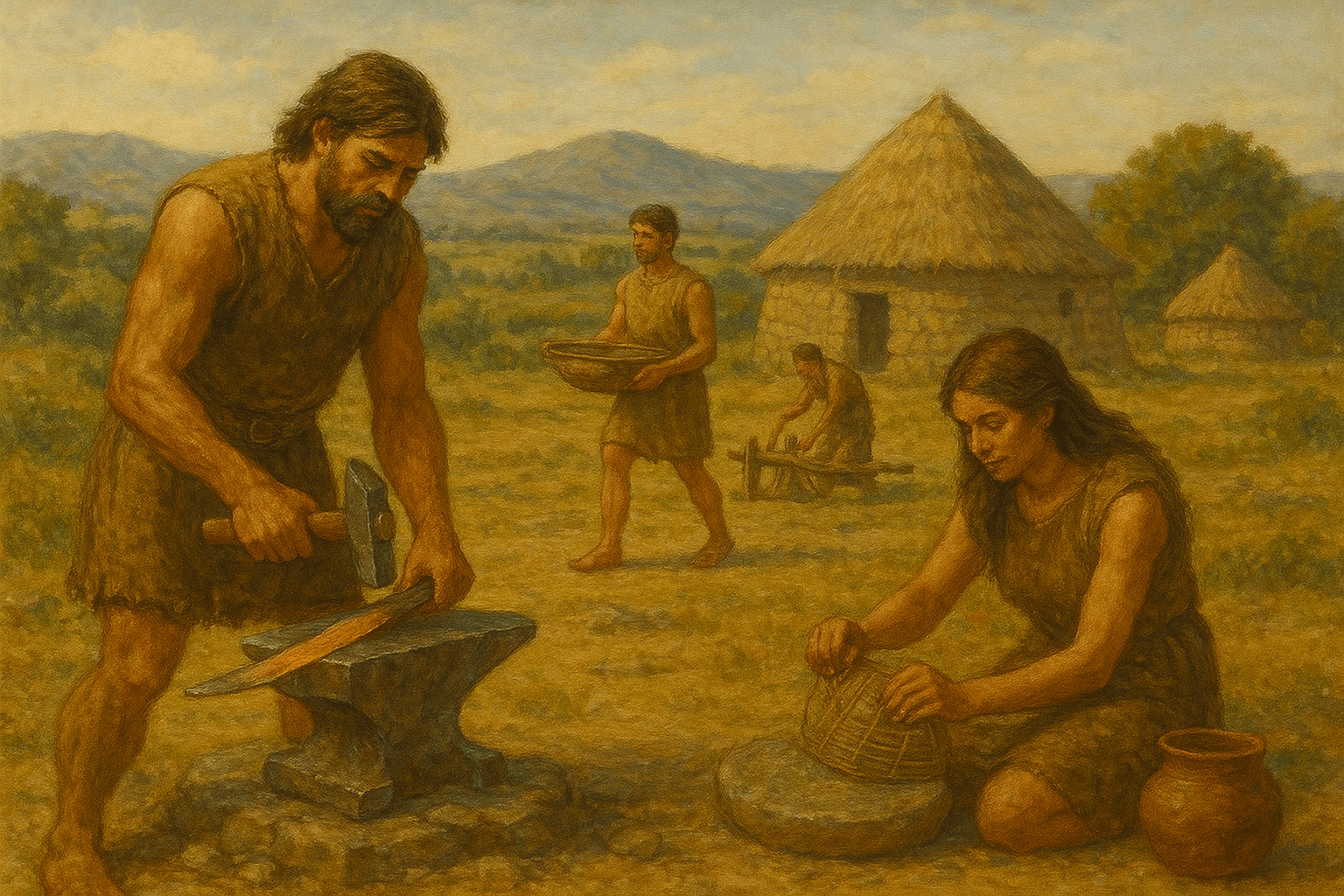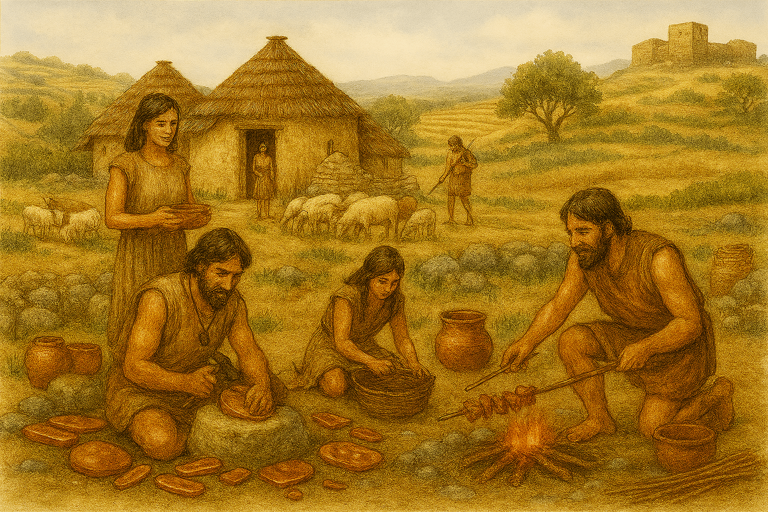 • Formas de vida: Economía de producción: cultivan campos de secano (cereal, legumbres) y crían animales domésticos (oveja, cabra, cerdo) como base del sustento. Se quedan en aldeas (a veces fortificadas con empalizadas) junto a ríos o llanuras fértiles. Aunque caza y recolección disminuyen, siguen complementando la dieta. Las viviendas evolucionan de cuevas a estructuras primitivas de adobe/madera. La sociedad tribal se organiza alrededor de clanes agrarios y chamanes (ceremonias funerarias comunitarias, tumbas colectivas).