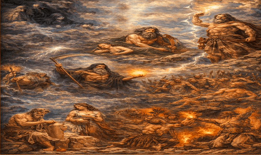 De Caos al orden olímpico: del vacío al cosmos gobernado por Zeus.
